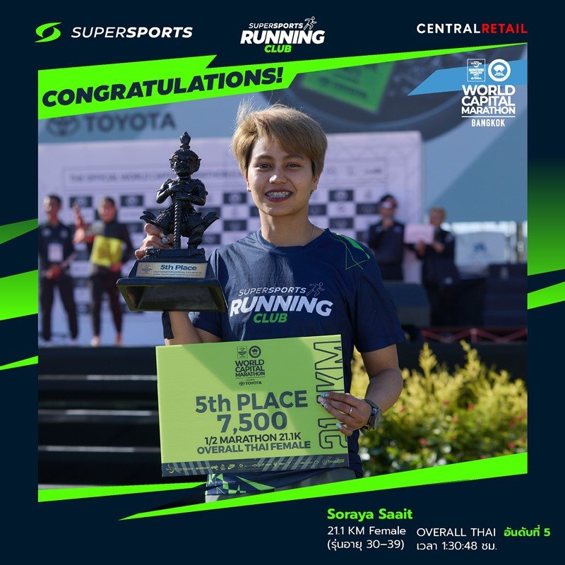 🏃♀️ Soraya Saait 🥇 อันดับ 5 > Overall Thai Female – 21.1 KM (รุ่นอายุ 30–39) ⏱ 1:30:48 ชม.