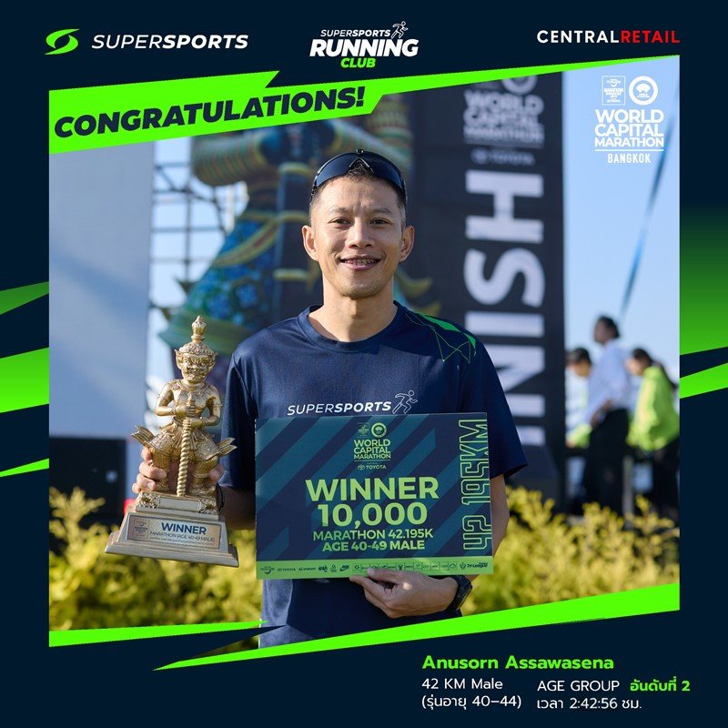 🏃♂️ Anusorn Assawasena 🥇 อันดับ 2 > Age Group Male – 42.195 KM (รุ่นอายุ 40–49) ⏱ 2:42:56 ชม.