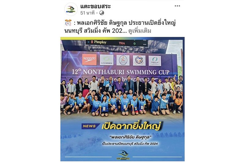 มื่อวันที่ 1 มิ.ย. 67 ที่สระว่ายน้ำองค์การบริหารส่วนจังหวัดนนทบุรี ได้มีพิธีเปิดการแข่งขันว่ายน้ำรายการ “นนทบุรี สวิมมิ่ง คัพ 2024” สนับสนุนโดย Speedo Thailand โดยมี พลเอก ศิริชัย ดิษฐกุล อุปนายกสมาคมกีฬาทางน้ำแห่งประเทศไทย เป็นประธาน พร้อมด้วย พันตำรวจเอก ดร.ธงชัย เย็นประเสริฐ นายกองค์การบริหารส่วนจังหวัดนนทบุรี และ ดร.เฉลิมพล นิยมสินธุ์ ประธานที่ปรึกษาชมรมว่ายน้ำจังหวัดนนทบุรี ร่วมในพิธี
